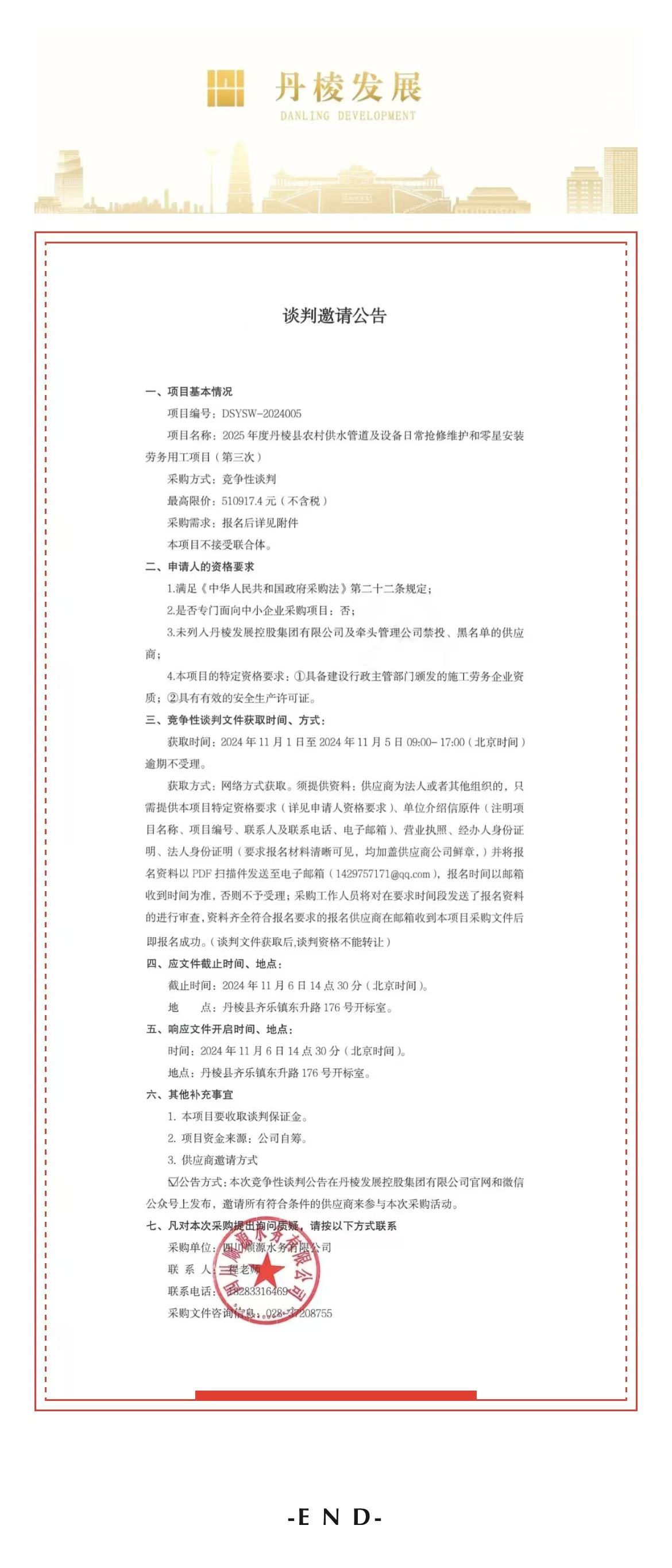 2025年度丹棱縣農(nóng)村供水管道及設(shè)備日常搶修維護(hù)和零星安裝勞務(wù)用工項(xiàng)目(第三次)談判邀請(qǐng)公告