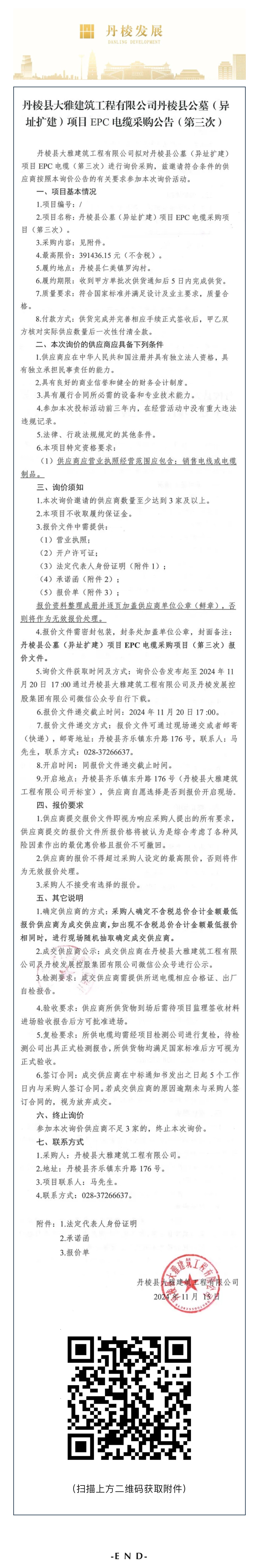 丹棱縣大雅建筑工程有限公司丹棱縣公墓(異址擴(kuò)建)項(xiàng)目EPC電纜采購公告(第三次)