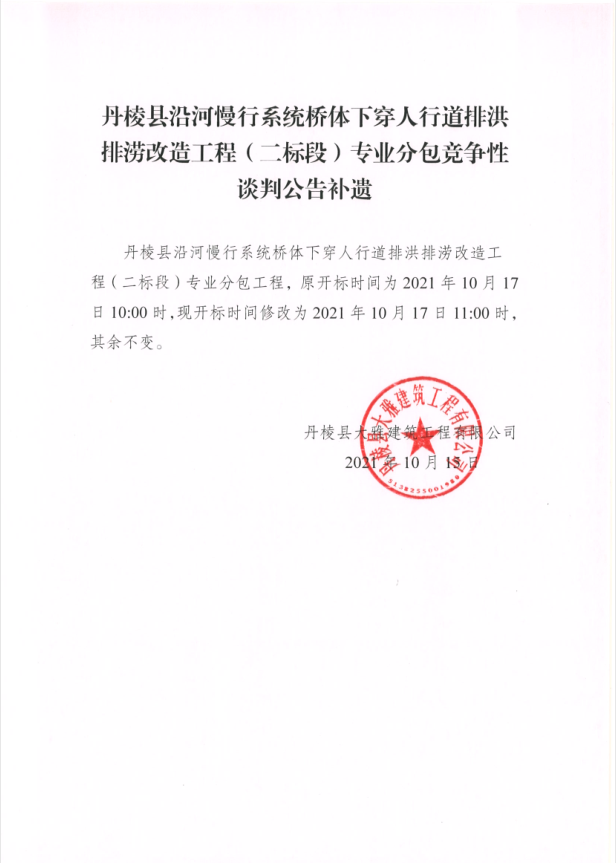 【大雅建筑公司】丹棱縣沿河慢行系統(tǒng)橋體下穿人行道排洪排澇改造工程(二標(biāo)段)專業(yè)分包競(jìng)爭(zhēng)性談判公告補(bǔ)遺