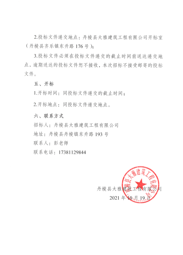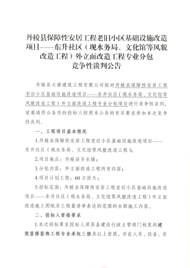 【大雅建筑公司】丹棱縣保障性安居工程老舊小區(qū)基礎(chǔ)設(shè)施改造項(xiàng)目--東升社區(qū)(現(xiàn)水務(wù)局、文化館等風(fēng)貌改造工程)外立面改造工程專業(yè)分包競爭性談判公告