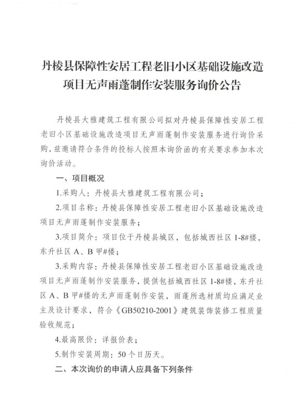 【大雅建筑公司】丹棱縣保障性安居工程老舊小區(qū)基礎(chǔ)設(shè)施改造項(xiàng)目無(wú)聲雨蓬制作安裝服務(wù)詢價(jià)公告