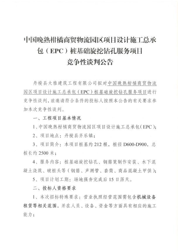 【大雅建筑公司】中國(guó)晚熟柑橘商貿(mào)物流園區(qū)項(xiàng)目設(shè)計(jì)施工總承包(EPC)樁基礎(chǔ)旋挖鉆孔服務(wù)項(xiàng)目競(jìng)爭(zhēng)性談判公告