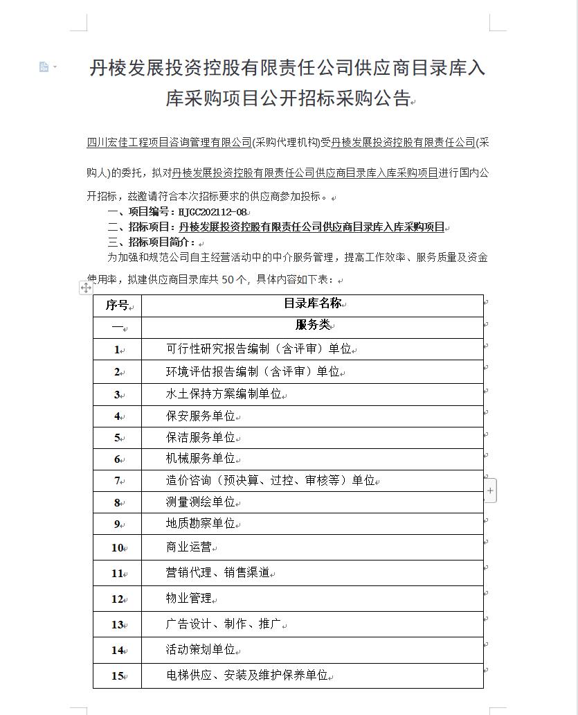 【丹發(fā)展公司】丹棱發(fā)展投資控股有限責任公司供應(yīng)商目錄庫入庫采購項目公開招標采購公告
