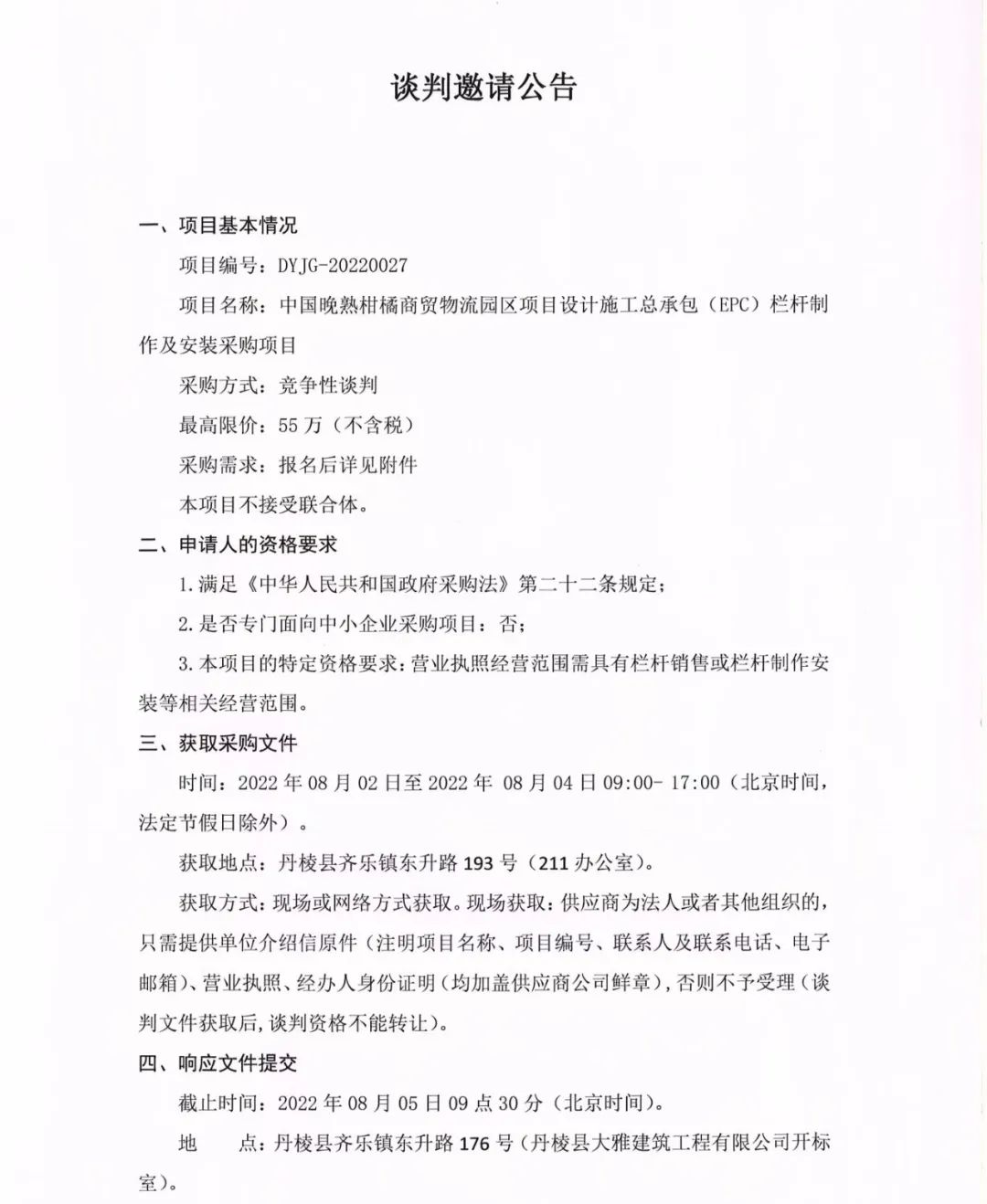 中國晚熟柑橘商貿(mào)物流園區(qū)項(xiàng)目設(shè)計(jì)施工總承包(EPC)欄桿制作及安裝采購項(xiàng)目談判邀請公告