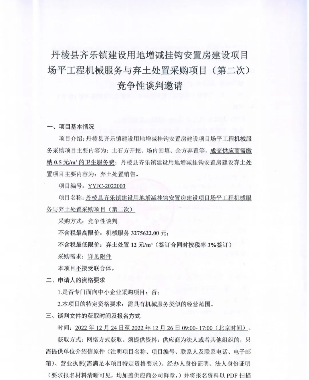 丹棱縣齊樂(lè)鎮(zhèn)建設(shè)用地增減掛鉤安置房建設(shè)項(xiàng)目場(chǎng)平工程機(jī)械服務(wù)與棄土處置采購(gòu)項(xiàng)目(第二次)競(jìng)爭(zhēng)性談判邀請(qǐng)