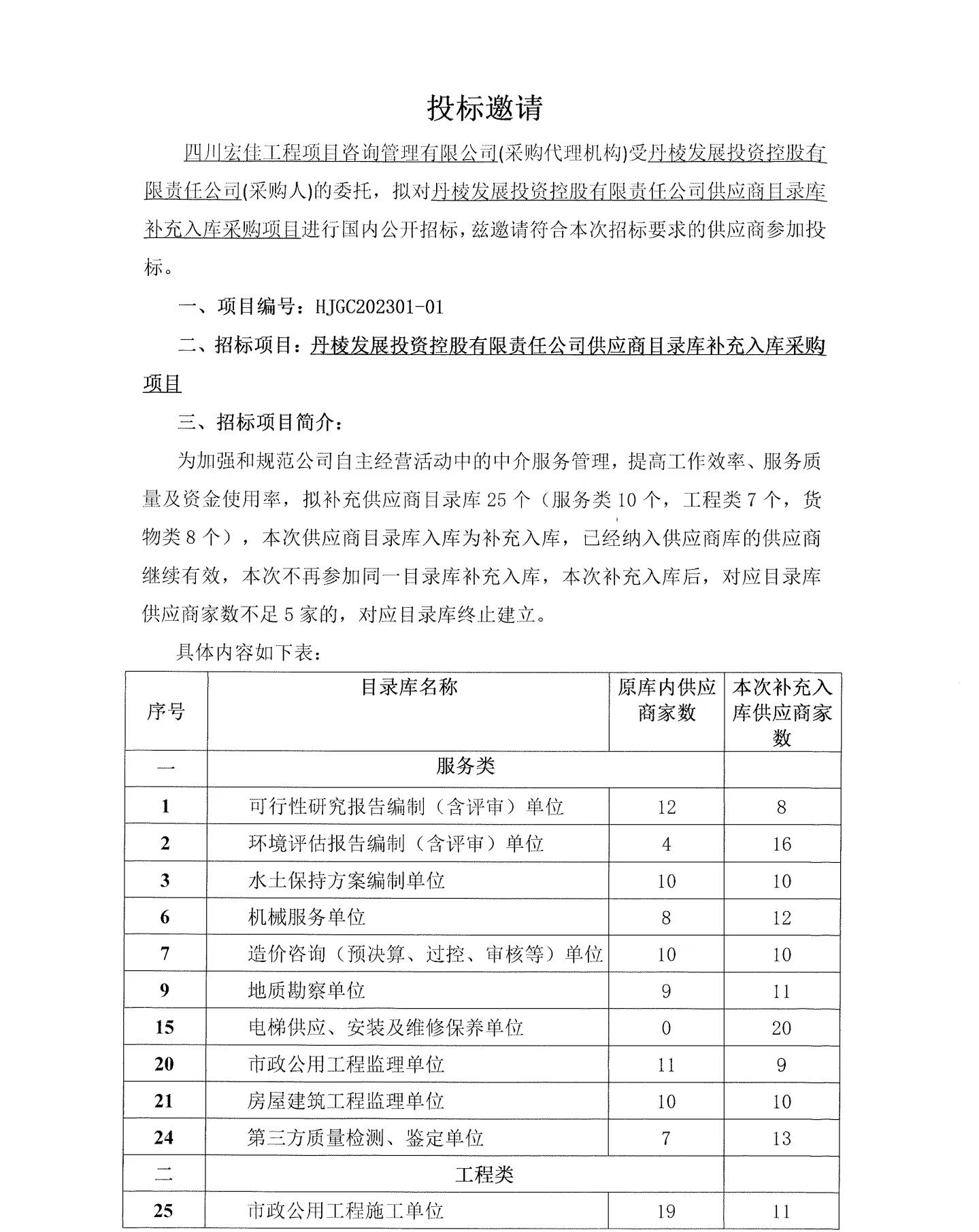 丹棱發(fā)展投資控股有限責(zé)任公司供應(yīng)商目錄庫(kù)補(bǔ)充入庫(kù)采購(gòu)項(xiàng)目投標(biāo)邀請(qǐng)公告