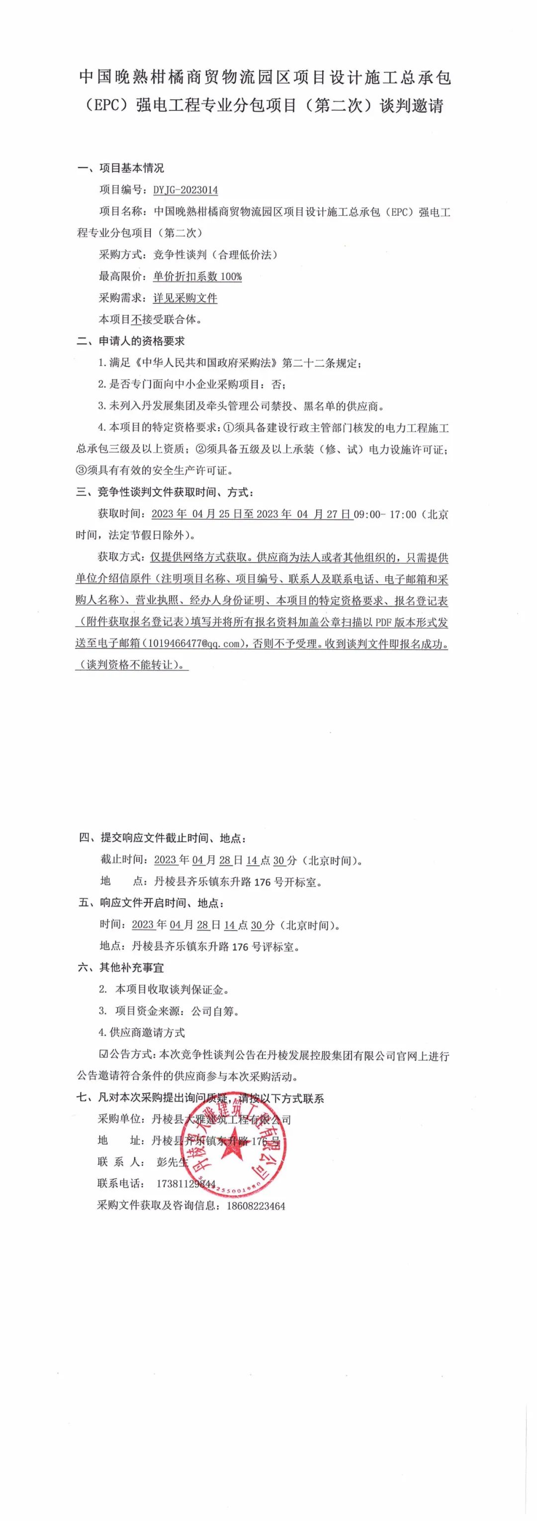 中國晚熟柑橘商貿(mào)物流園區(qū)項(xiàng)目設(shè)計(jì)施工總承包(EPC)強(qiáng)電工程專業(yè)分包項(xiàng)目(第二次)競爭性談判邀請