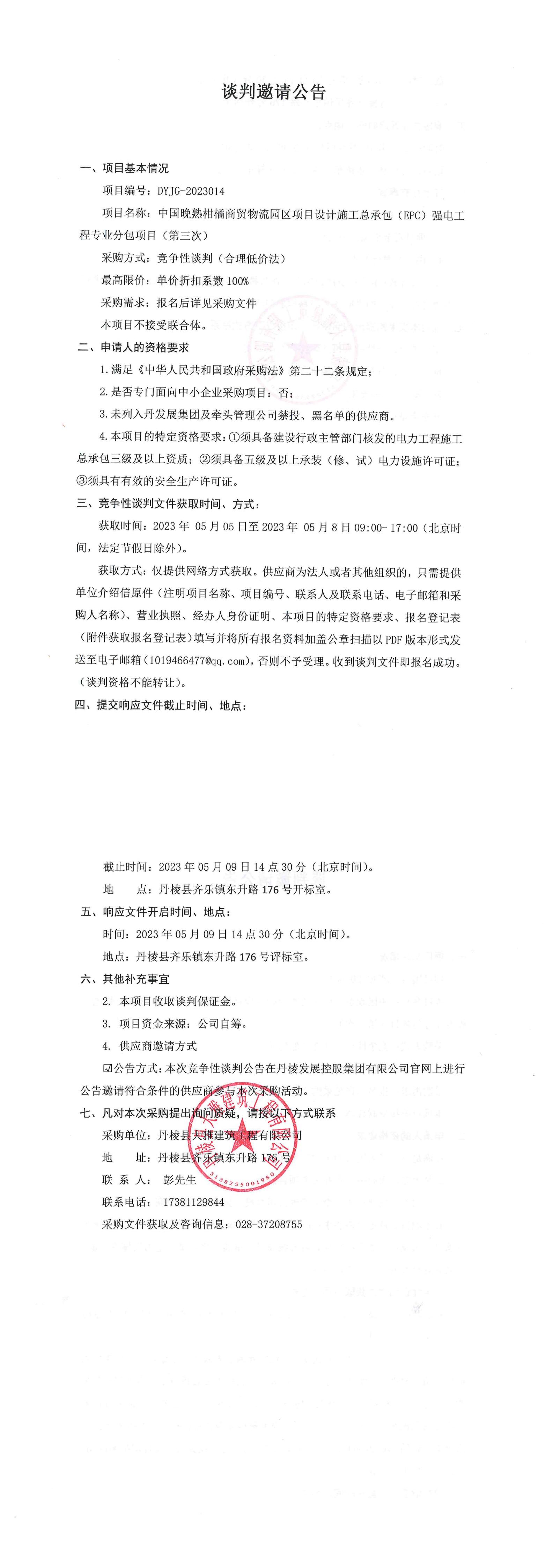 中國(guó)晚熟柑橘商貿(mào)物流園區(qū)項(xiàng)目設(shè)計(jì)施工總承包(EPC)強(qiáng)電工程專業(yè)分包項(xiàng)目(第三次)談判邀請(qǐng)公告