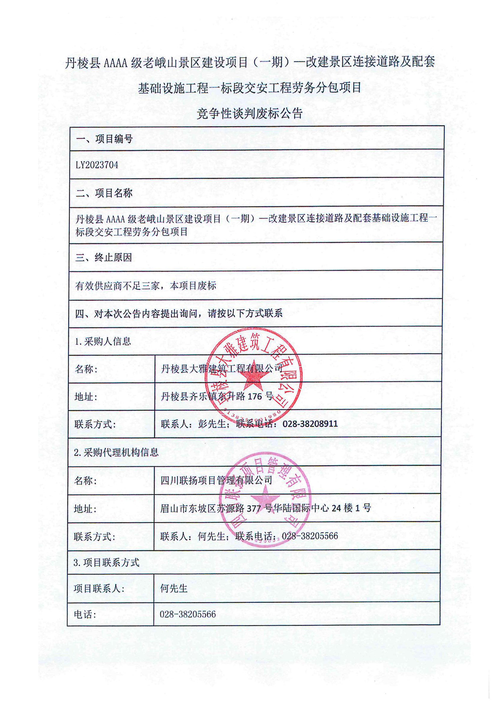 丹棱縣AAAA級老峨山景區(qū)建設(shè)項目(一期)一改建景區(qū)連接道路及配套基礎(chǔ)設(shè)施工程一標(biāo)段交安工程勞務(wù)分包項目競爭性談判廢標(biāo)公告