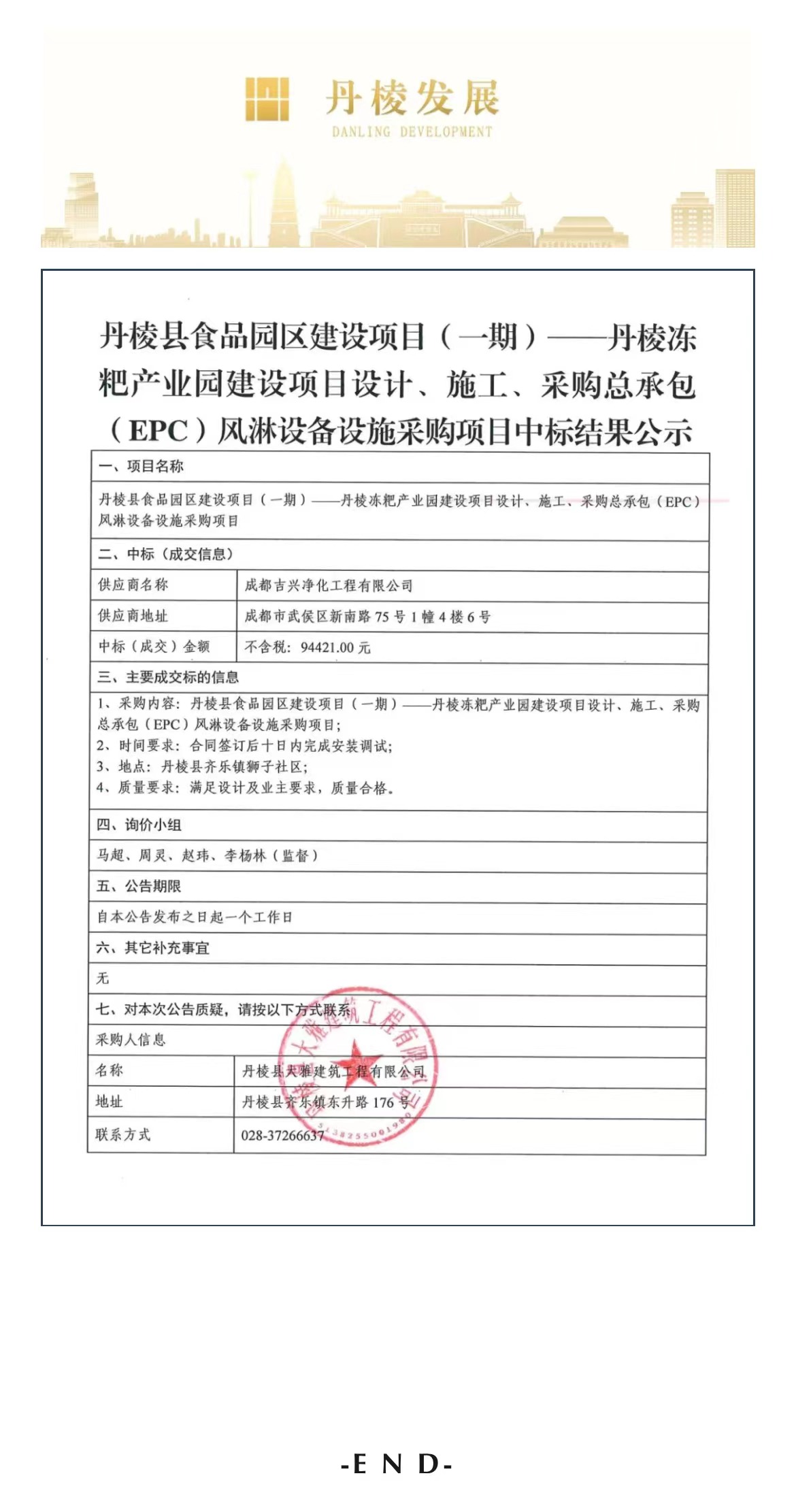 丹棱縣食品園區(qū)建設項目(一期)—丹棱凍粑產(chǎn)業(yè)園建設項目設計、施工、采購總承包(EPC)風淋設備設施詢價采購項目中標結(jié)果公示