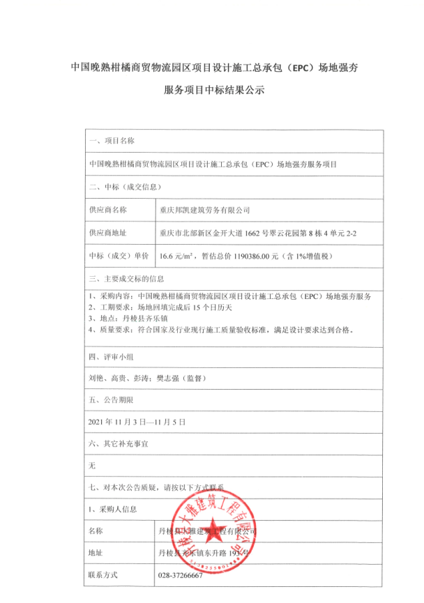 【大雅建筑公司】中國晚熟柑橘商貿(mào)物流園區(qū)項(xiàng)目設(shè)計(jì)施工總承包(EPC)場地強(qiáng)夯服務(wù)項(xiàng)目中標(biāo)結(jié)果公示