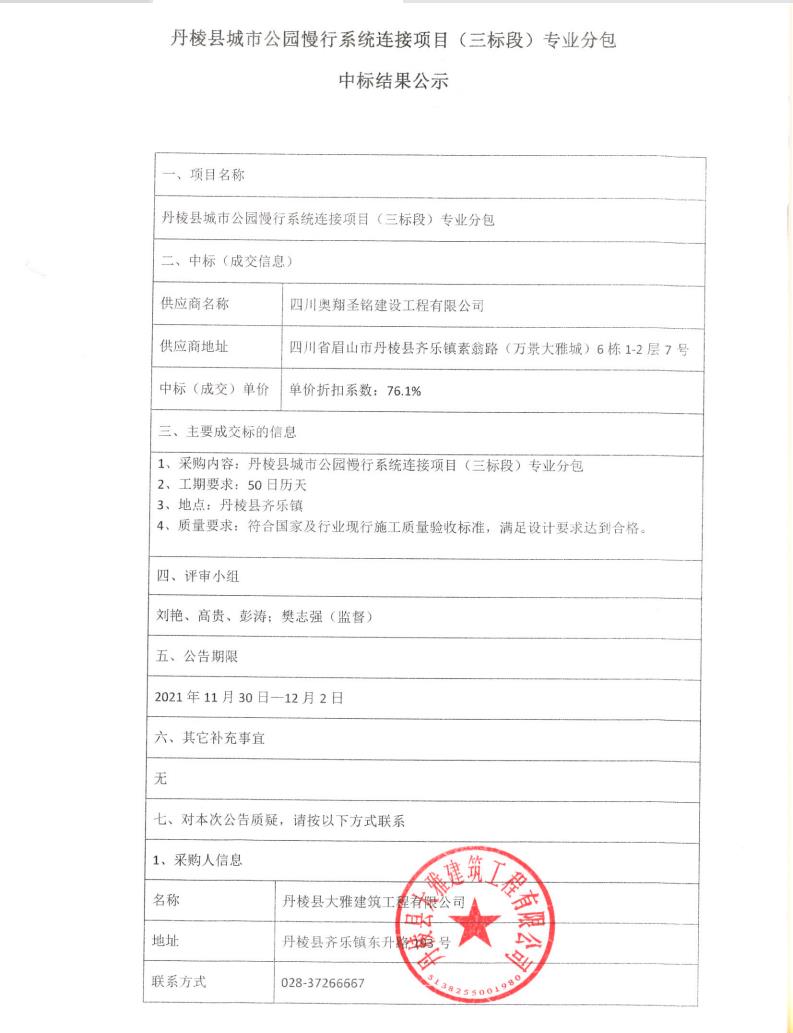 【大雅建筑公司】丹棱縣城市公園慢行系統(tǒng)連接項(xiàng)目(三標(biāo)段)專(zhuān)業(yè)分包中標(biāo)結(jié)果公示