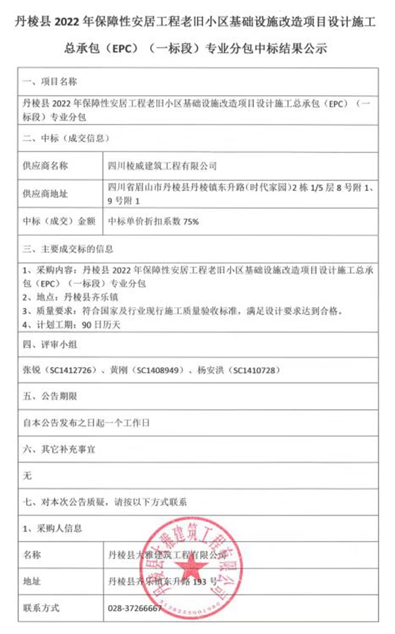 丹棱縣2022年保障性安居工程老舊小區(qū)基礎(chǔ)設(shè)施改造項(xiàng)目設(shè)計(jì)施工總承包(EPC)(一標(biāo)段)專(zhuān)業(yè)分包中標(biāo)結(jié)果公示