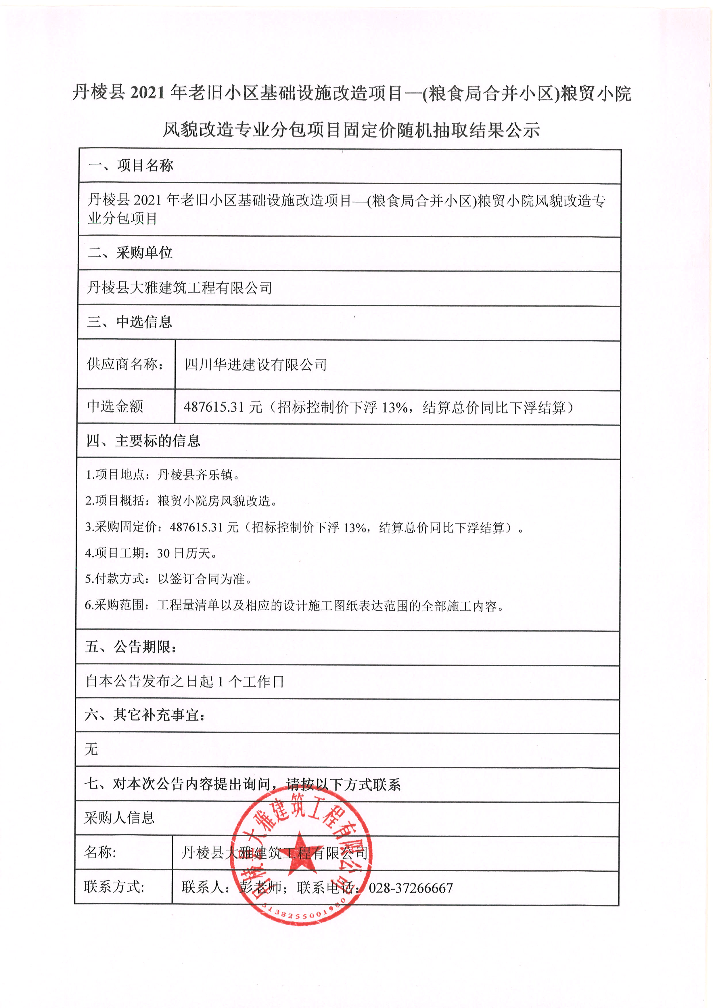 丹棱縣2021年老舊小區(qū)基礎設施改造項目一(糧食局合并小區(qū))糧貿(mào)小院 風貌改造專業(yè)分包項目固定價隨機抽取結(jié)果公示