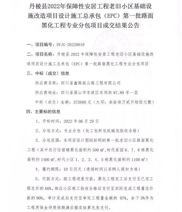 丹棱縣2022年保障性安居工程老舊小區(qū)基礎(chǔ)設(shè)施改造項目設(shè)計施工總承包(EPC)第一批路面黑化工程專業(yè)分包項目成交結(jié)果公告