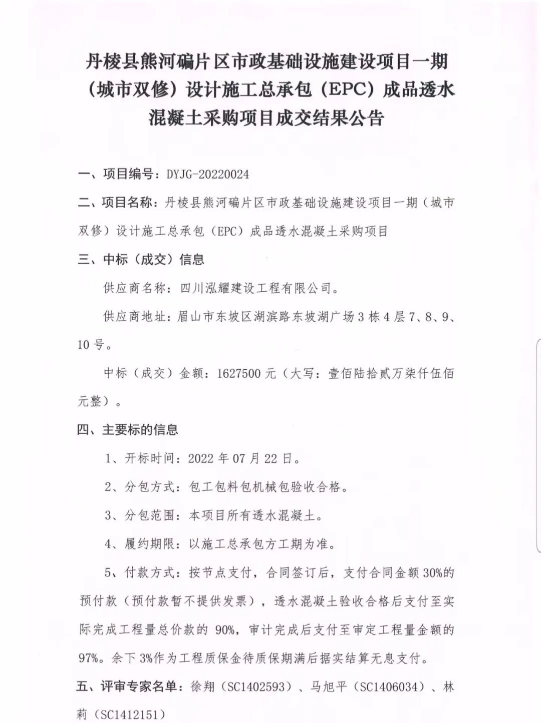 丹棱縣熊河碥片區(qū)市政基礎(chǔ)設(shè)施建設(shè)項(xiàng)目一期(城市雙修)設(shè)計(jì)施工總承包(EPC)成品透水混凝土采購(gòu)項(xiàng)目成交結(jié)果公告
