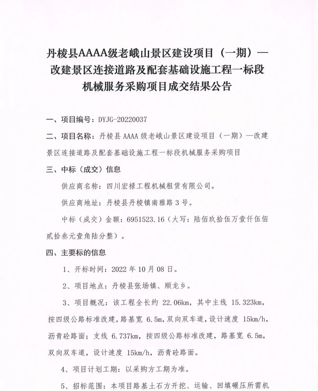丹棱縣AAAA級老峨山景區(qū)建設(shè)項(xiàng)目(一期)--改建景區(qū)連接道路及配套基礎(chǔ)設(shè)施工程一標(biāo)段機(jī)械服務(wù)采購項(xiàng)目成交結(jié)果公告