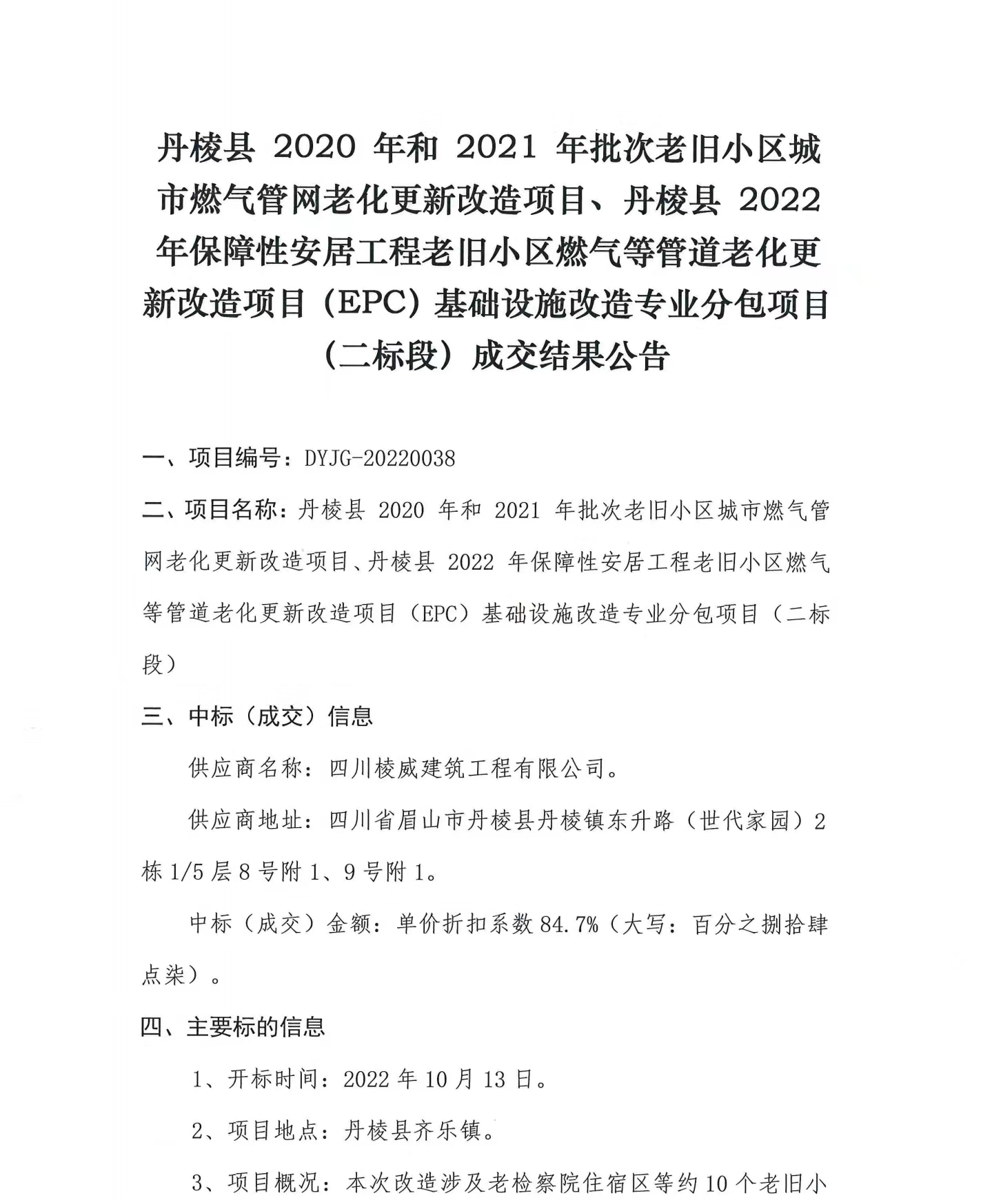 丹棱縣2020年、2021年和2022年老舊小區(qū)城市燃?xì)夤芫W(wǎng)老化更新改造項目基礎(chǔ)設(shè)施改造專業(yè)分包項目(二標(biāo)段)成交結(jié)果公告