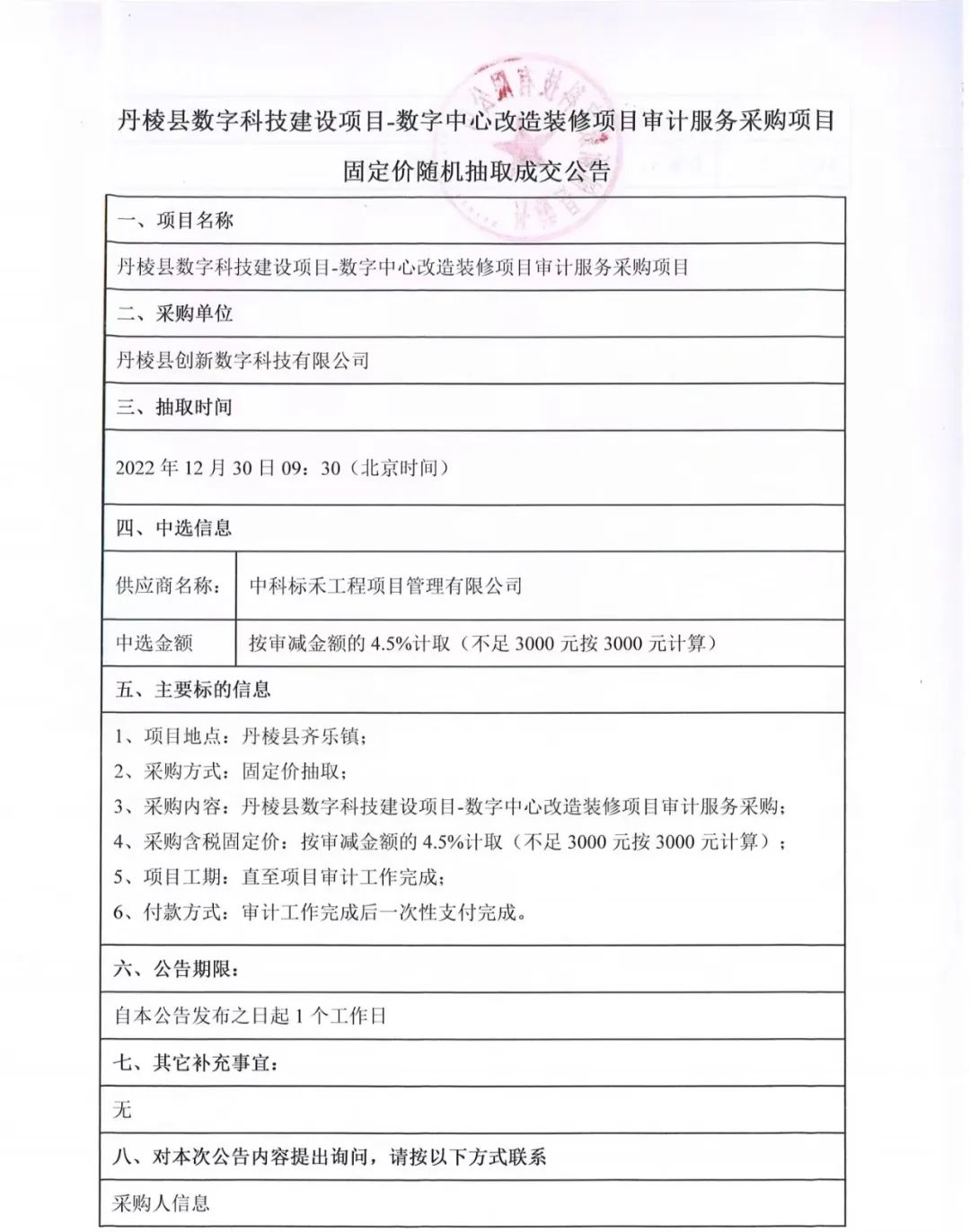 丹棱縣數(shù)字科技建設(shè)項(xiàng)目-數(shù)字中心改造裝修項(xiàng)目審計(jì)服務(wù)采購(gòu)項(xiàng)目固定價(jià)隨機(jī)抽取成交公告