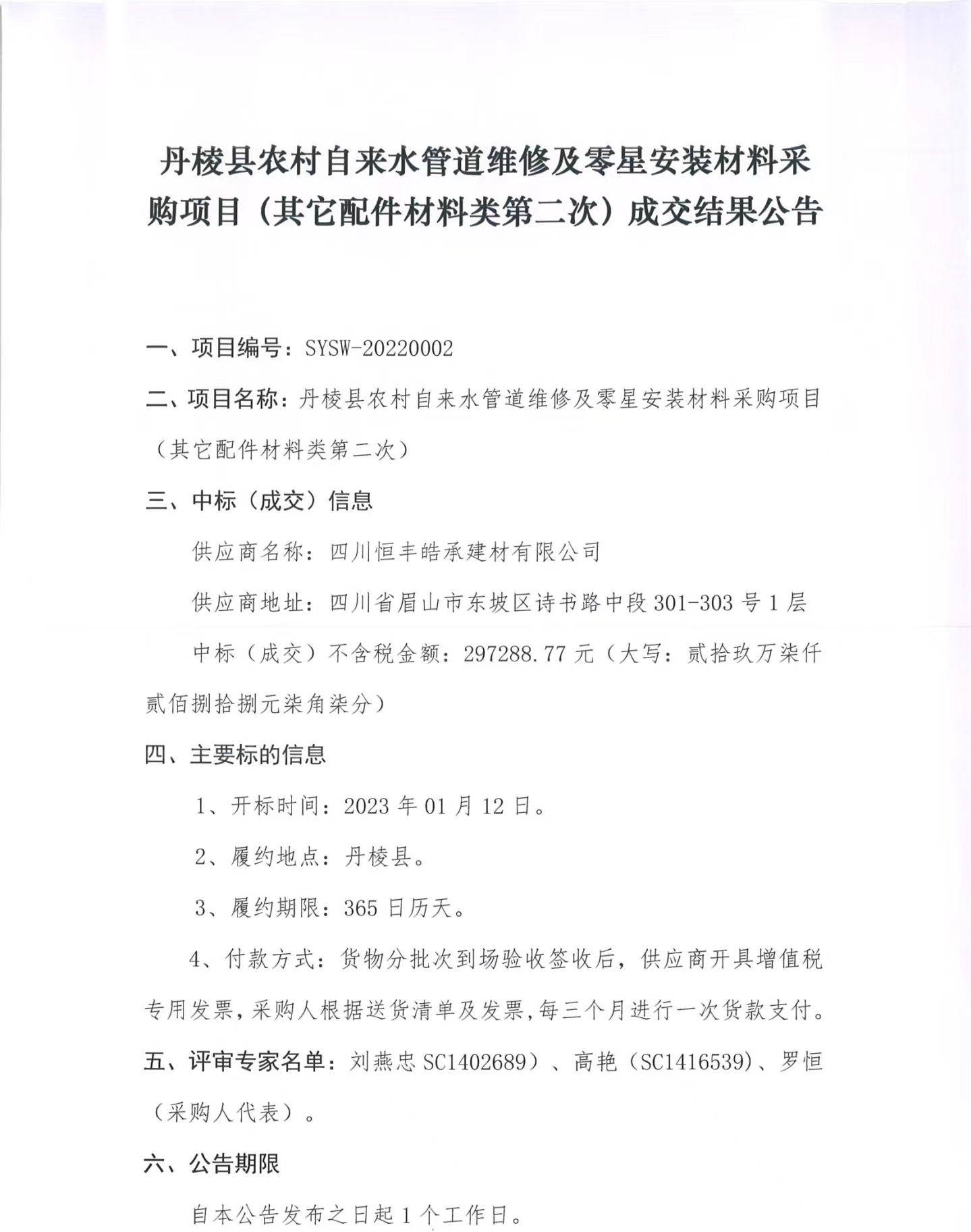 丹棱縣農(nóng)村自來水管道維修及零星安裝材料采購項目(其它配件材料類第二次) 成交結(jié)果公告