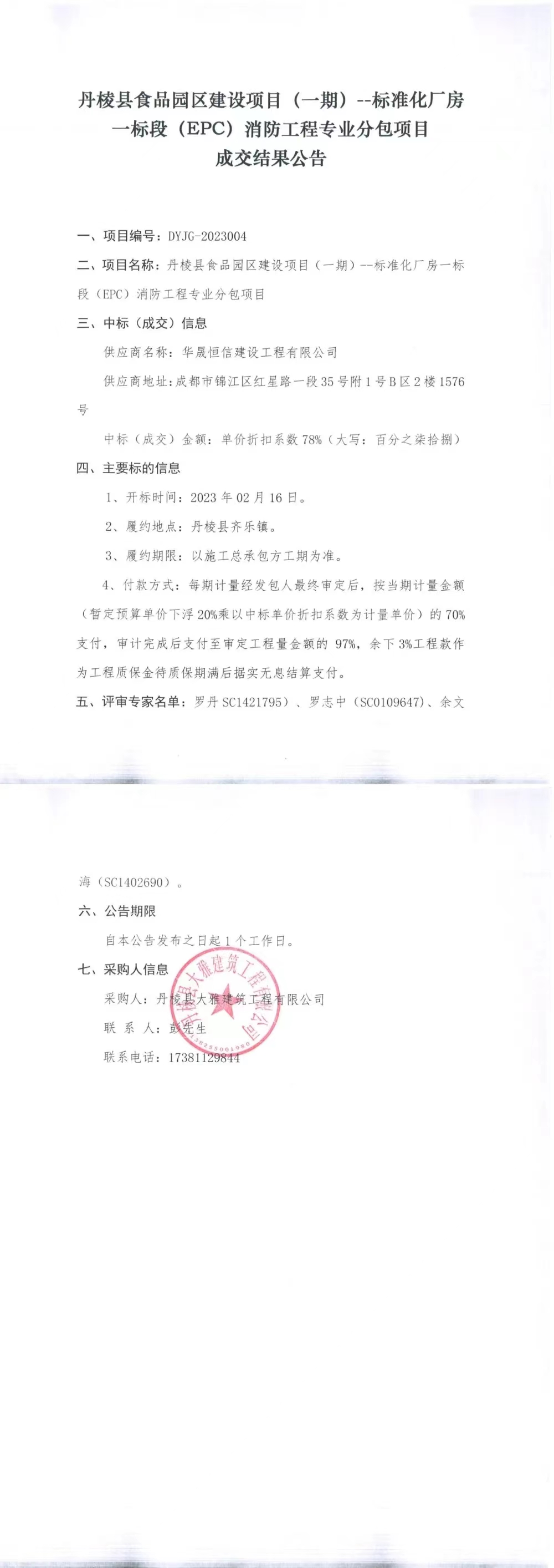 丹棱縣食品園區(qū)建設(shè)項(xiàng)目(一期)--標(biāo)準(zhǔn)化廠房一標(biāo)段(EPC)消防工程專業(yè)分包項(xiàng)目成交結(jié)果公告