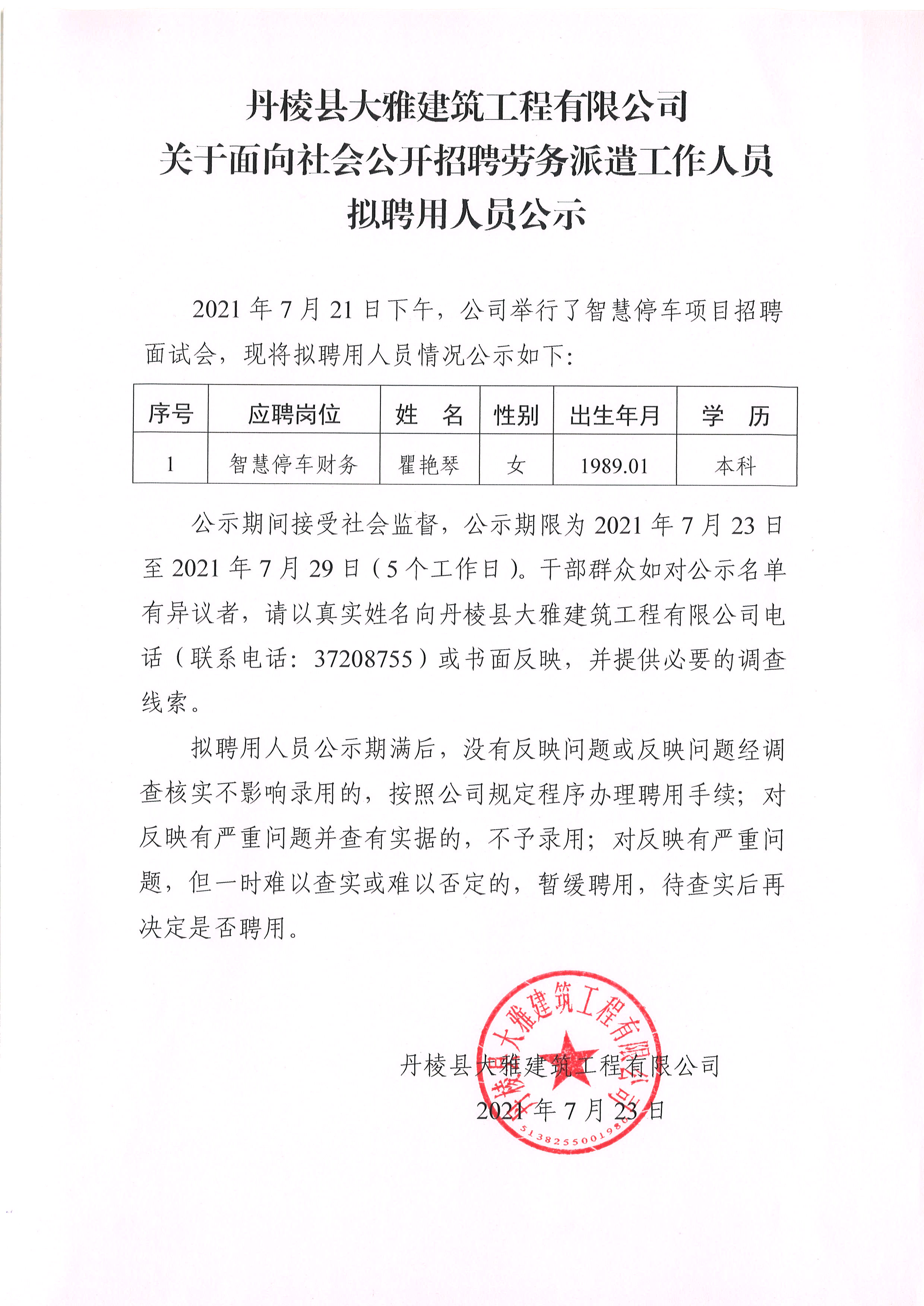 【大雅建筑公司】關(guān)于面向社會(huì)公開(kāi)招聘勞務(wù)派遣工作人員擬聘用人員公示