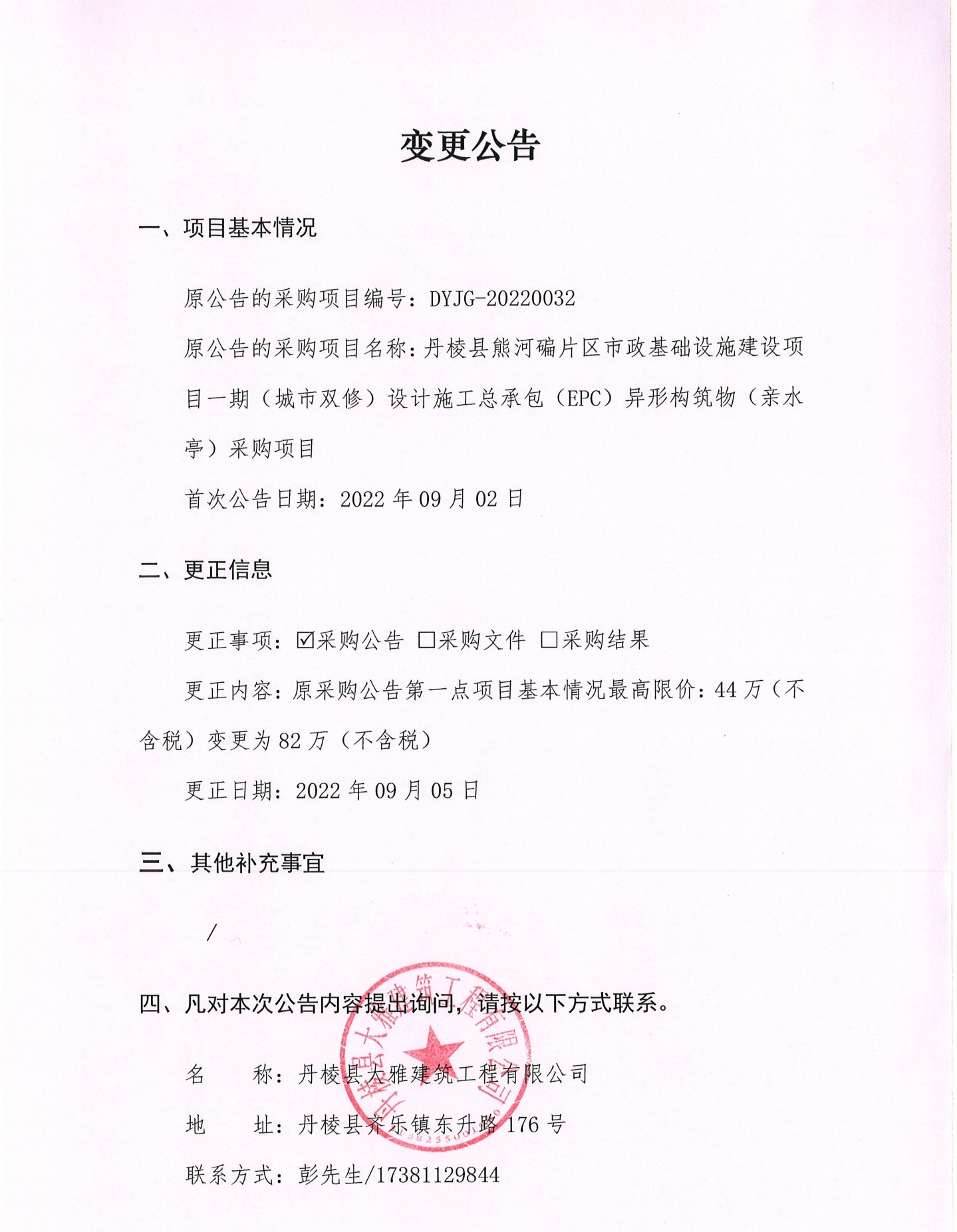 丹棱縣熊河碥片區(qū)市政基礎(chǔ)設(shè)施建設(shè)項(xiàng)目一期(城市雙修)設(shè)計(jì)施工總承包(EPC)異形構(gòu)筑物(親水亭)采購(gòu)項(xiàng)目變更公告