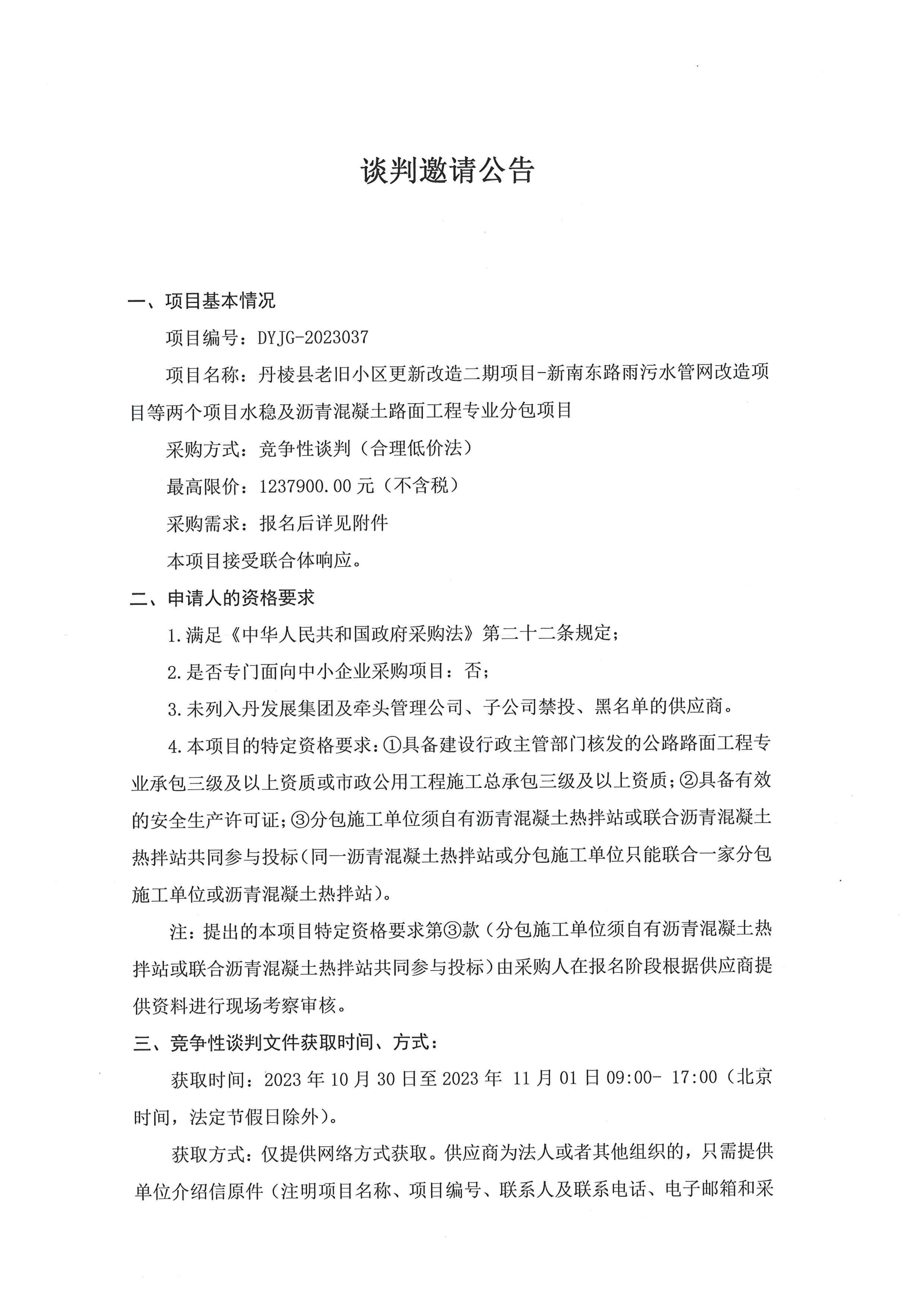 丹棱縣老舊小區(qū)更新改造二期項(xiàng)目-新南東路雨污水管網(wǎng)改造項(xiàng)目等兩個(gè)項(xiàng)目水穩(wěn)及瀝青混凝土路面工程專(zhuān)業(yè)分包項(xiàng)目談判邀請(qǐng)公告