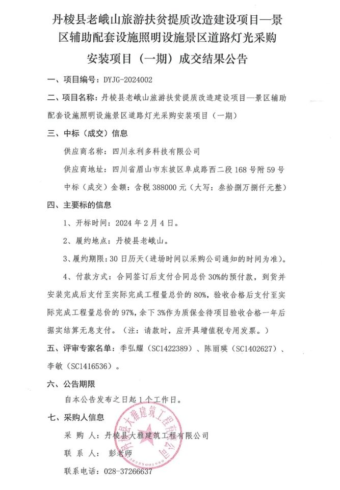 丹棱縣老峨山旅游扶貧提質(zhì)改造建設(shè)項目—景區(qū)輔助配套設(shè)施照明設(shè)施景區(qū)道路燈光采購安裝項目(一期)成交結(jié)果公告