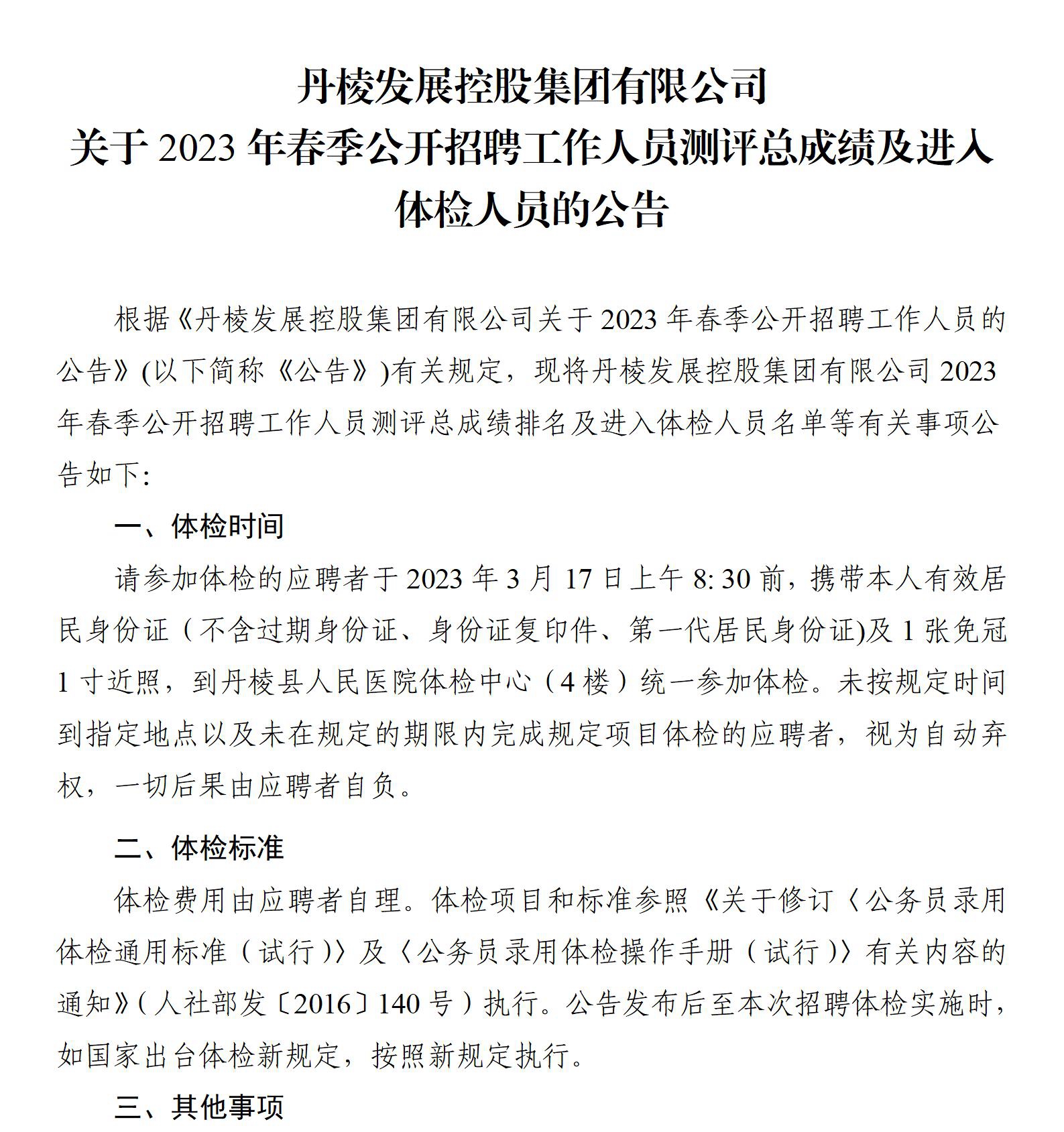 丹棱發(fā)展控股集團(tuán)有限公司關(guān)于2023年春季公開招聘工作人員測(cè)評(píng)總成績(jī)及進(jìn)入體檢人員的公告