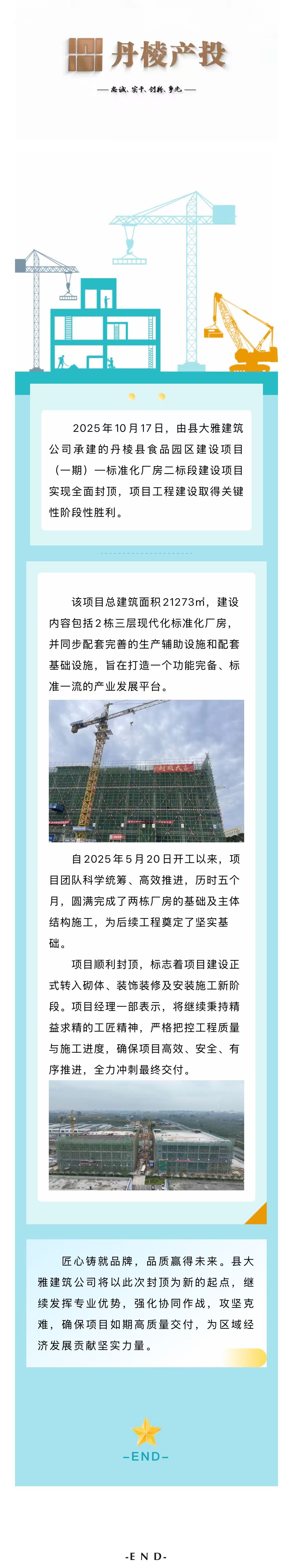 【縣大雅建筑公司】丹棱縣食品園區(qū)建設(shè)項(xiàng)目(一期)—標(biāo)準(zhǔn)化廠房二標(biāo)段建設(shè)項(xiàng)目順利封頂