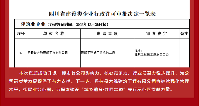 【縣大雅建筑公司】喜報!成功升級“建筑工程施工總承包二級”資質(zhì)!